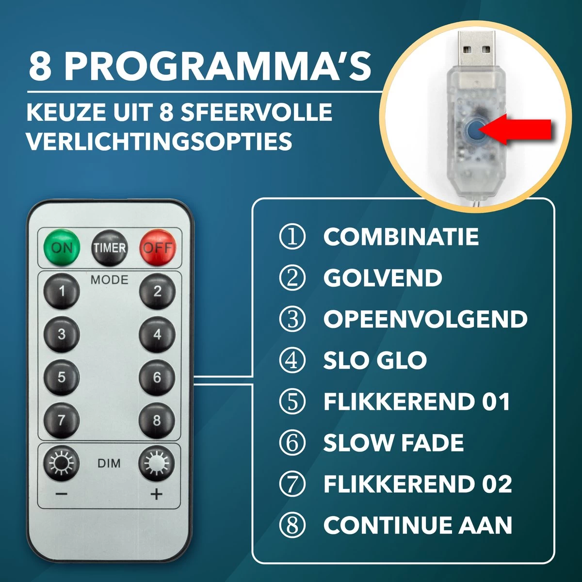 Het lichtsnoer werkt op een meegeleverde USB-kabel. Sluit deze aan op een USB-blokje, een powerbank of laptop en geniet van de sfeer die je tegemoet komt! Een extra tip: met een USB-blokje in een timer, kun je het lichtsnoer elke avond automatisch aan laten springen!