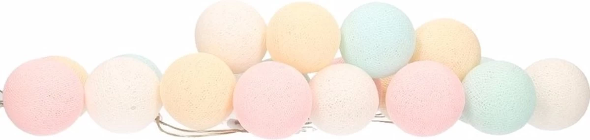 Feestverlichting lichtsnoer met pastel kleurige balletjes, in verschillende tinten. Deze Cotton Balls feestverlichting bevat 20 mintgroene, gele, roze en witte balletjes. Geschikt voor gebruik binnenshuis.