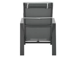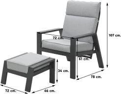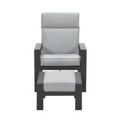 De Lora verstelbare tuinstoel is gemaakt van een stevig en onderhoudsvrij aluminium frame. Dit aluminium frame is voorzien van een sterke donker grijze poeder coating laag. Deze beschermlaag zorgt er voor dat de stoel kras- en stootvast is. Voor de zitting en de rugleuning van deze stoel is gebruik gemaakt van een textilene all-weather doek. Dit doek zorgt voor een fijn zitcomfort, doordat het een beetje meeviert. De Lora tuinstoel met voetenbank worden geleverd met comfortabele licht grijze kussens.