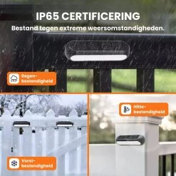 Een hevige regenbui of een sneeuwstorm is geen probleem voor deze wandlamp. Dankzij de IP65 rating kan hij tegen een stootje. Het mono kristallijne zonnepaneel zorgt ervoor dat de accu ook bij bewolkt weer nog kan opladen. Dit zal niet zo snel gaan als op een heldere dag, maar de grote accu kan dit compenseren. Handig voor tijdens de winterdagen!