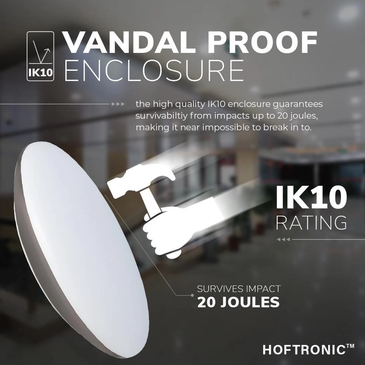 Deze plafonniere is voorzien van IK10 gehard glas. Daar zie je natuurlijk helemaal niets van, maar hierdoor kan de plafondlamp wel tegen een stootje. De lamp wordt dan ook veel toegepast als projectverlichting en als verlichting in openbare ruimtes.