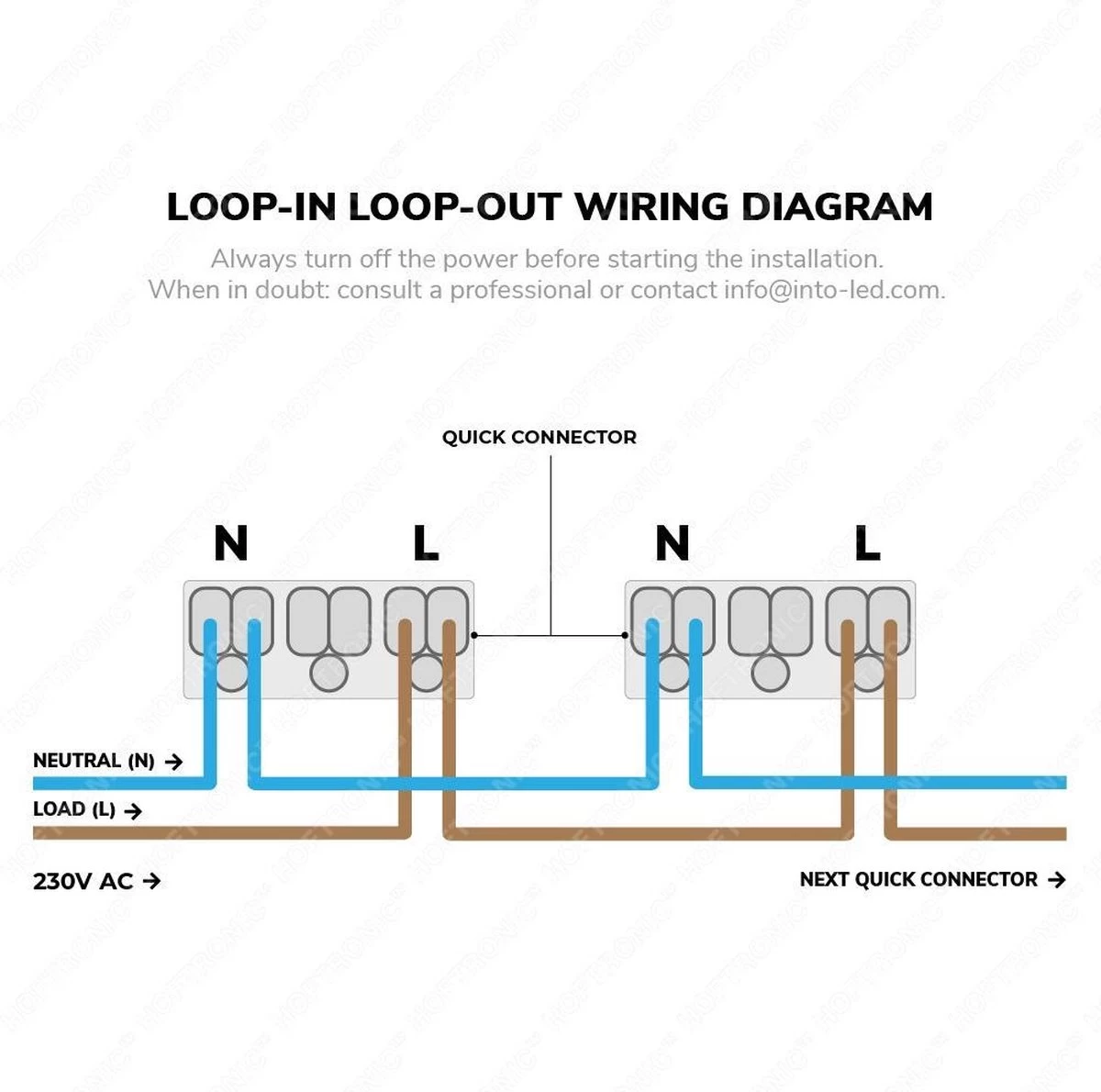 Dankzij de quick connector aansluitingen in de driver kun je deze volledig toolless installeren. Dit betekent dat je geen gereedschap nodig hebt zoals een schroevendraaier of kroonsteentjes. Het enige wat je hoeft te doen is de stroomdraden in de driver steken en de inbouwspot is aangesloten. Ook is de driver al voorbereid op het in serie schakelen van de inbouwspots. Hiervoor vind je een extra connector in het midden van de driver.