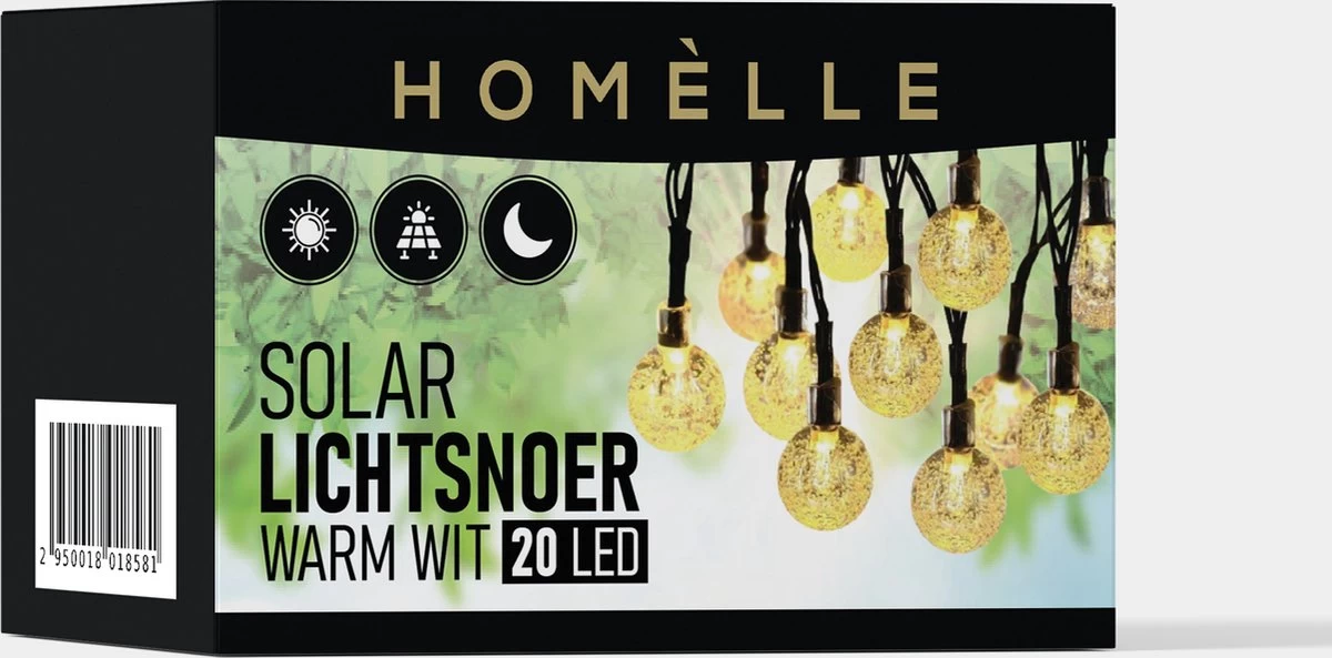 Vanaf het zonnepaneel tot het eerste lichtbolletje zit 2 meter en vanaf dat punt zijn het 20 LED bolletjes op 15 centimeter afstand van elkaar. Door de IP65 beveiliging is het product beschermd tegen hitte, vorst, hagel en regen.