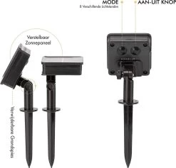 Vanaf het zonnepaneel tot het eerste lichtbolletje zit 2 meter en vanaf dat punt zijn het 30 LED bolletjes op 10 centimeter afstand van elkaar. Door de IP65 beveiliging is het product beschermd tegen hitte, vorst, hagel en regen.