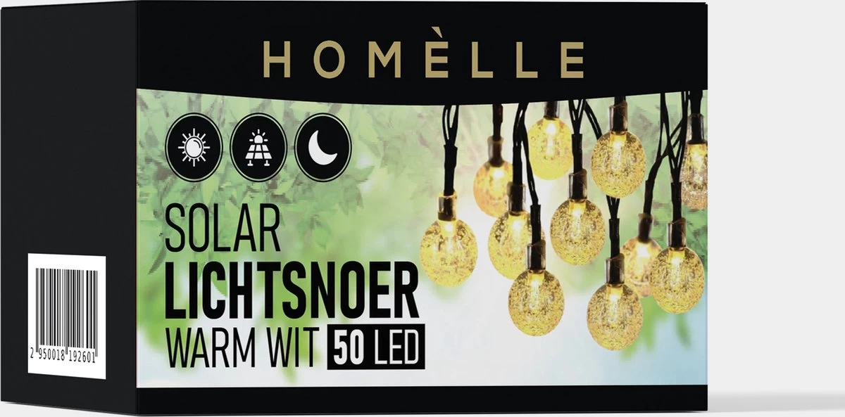 Vanaf het zonnepaneel tot het eerste lichtbolletje zit 2 meter en vanaf dat punt zijn het 50 LED bolletjes op 10 centimeter afstand van elkaar. Door de IP65 beveiliging is het product beschermd tegen hitte, vorst, hagel en regen.