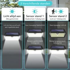 Je hebt de keuze uit drie handige lichtstanden zodat je eenvoudig een stand vindt die bij jouw situatie past: continu aan met gedimd licht, alleen aan op beweging, continu aan met gedimd licht en feller bij beweging. De bewegingssensor standen zijn zeer geschikt om dieven af te schrikken.