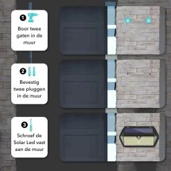 - Inhoud Verpakking: 1 x 266 LED solar lamp, 1 x handleiding, 2 x schroeven, 2 x pluggen