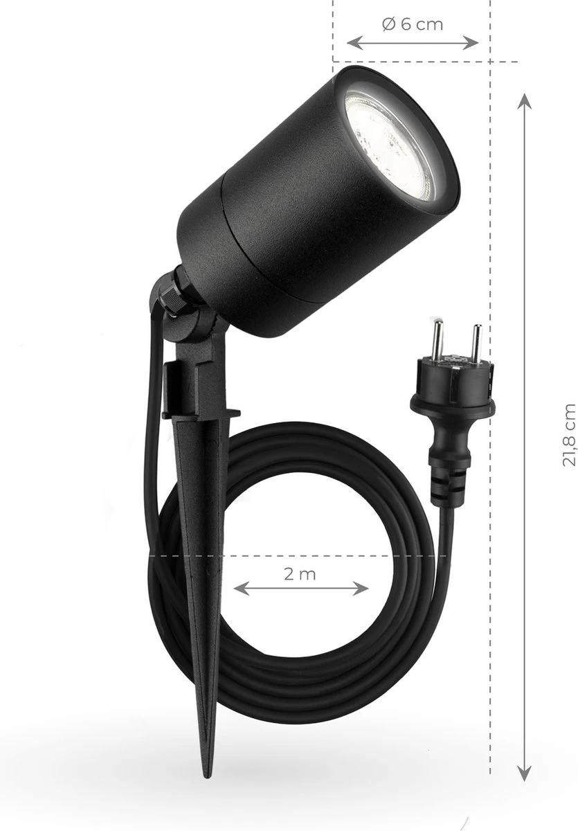 De prikspot buiten wordt geleverd met een netsnoer en kabel van circa 200cm. Het wordt aangeraden om een IP68 kabelverbinder mee te bestellen. Hiermee kun prikspot veilig worden aangesloten. Wanneer je de prikspot set compleet wilt maken dan raden wij het aan om een GU10 spot mee te bestellen. Hiermee zorg je ervoor dat er ook daadwerkelijk licht uit de prikspot gaat komen. Eenmaal een GU10 spot mee besteld dan is de prikspot set compleet en heb je alles in huis om de prikspot tuin te plaatsen en te laten schijnen.