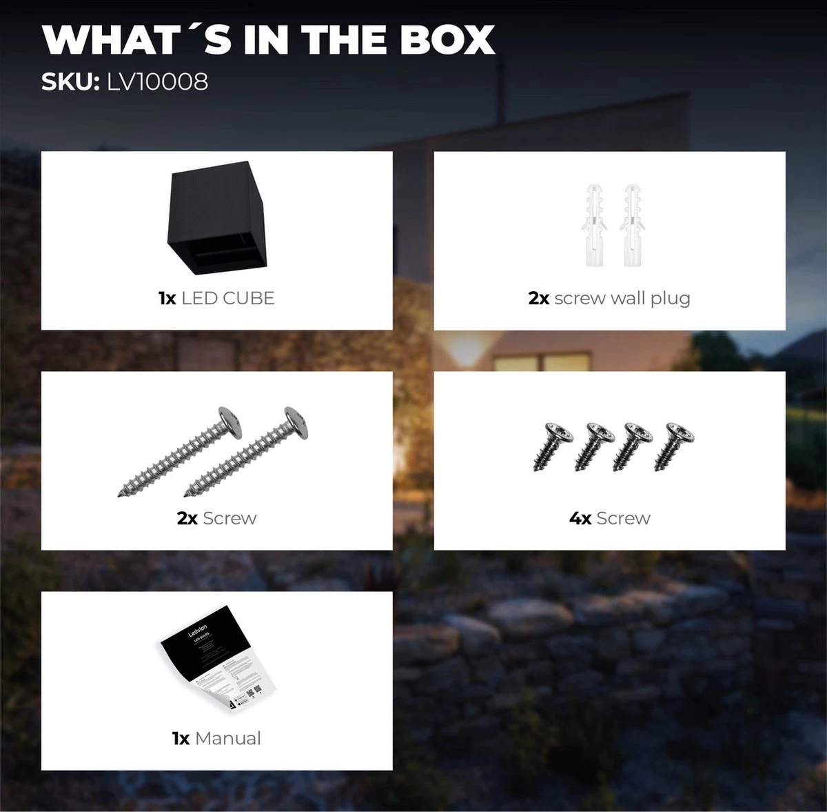 De LED wandlamp voor buiten wordt compleet geleverd. Naast een handleiding wordt er ook een installatiesetje meegeleverd. Aan de hand van het installatiesetje en de handleiding kan je de zwarte muurlamp snel en eenvoudig ophangen.