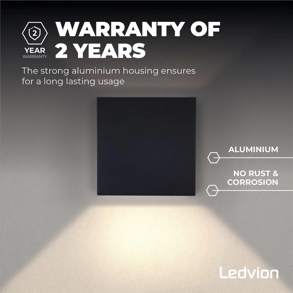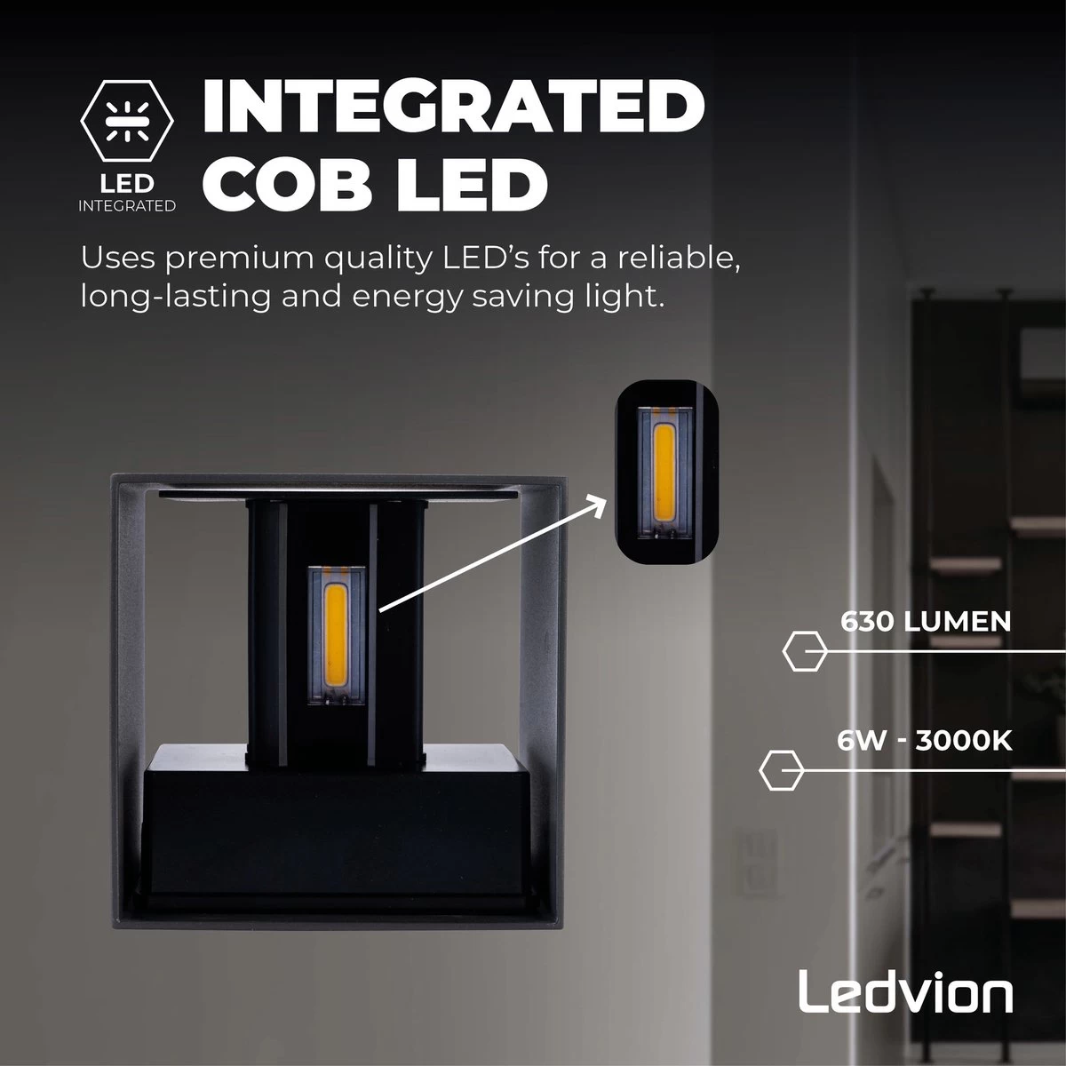De buitenlamp is voorzien van een lichtbron. Zowel aan de onder- als de bovenkant zitten hoogwaardige LED chips verwerkt. Hierdoor geeft de wandlamp aan twee kanten licht. Hiermee creëer je het unieke Up Down Light concept.