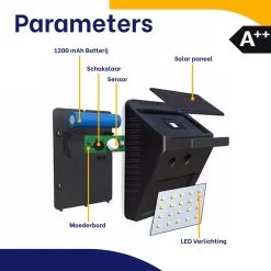 - Inhoud Verpakking: 2 x 97 LED solar lamp, 1 x gebruiksaanwijzing, 4 x schroeven, 4 x pluggen