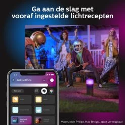 De zwarte Philips Hue Calla White and color ambiance lage sokkellamp is de perfecte uitbreiding op je bestaande Philips Hue Calla basisset. Deze uitbreiding wordt namelijk geleverd met een kabel voor aansluiting op de basisset. De Calla is voorzien van ingebouwde LED-verlichting die licht geeft in tot wel 16 miljoen kleuren. Ideaal dus om je tuin, tuinpad of oprit te verfraaien. Verbind de lamp aan je Hue systeem en Hue Bridge om hem te kunnen bedienen via de Philips Hue app op je smartphone of tablet. Daarmee kun je de lamp ook op een functionele manier gebruiken, bijvoorbeeld door middel van timers en automatische schakelfuncties. Met geofencing kun je bovendien je lampen automatisch laten aangaan als je het huis nadert. De Hue Calla is bovendien ook spatwaterdicht dankzij zijn IP44-classificatie.