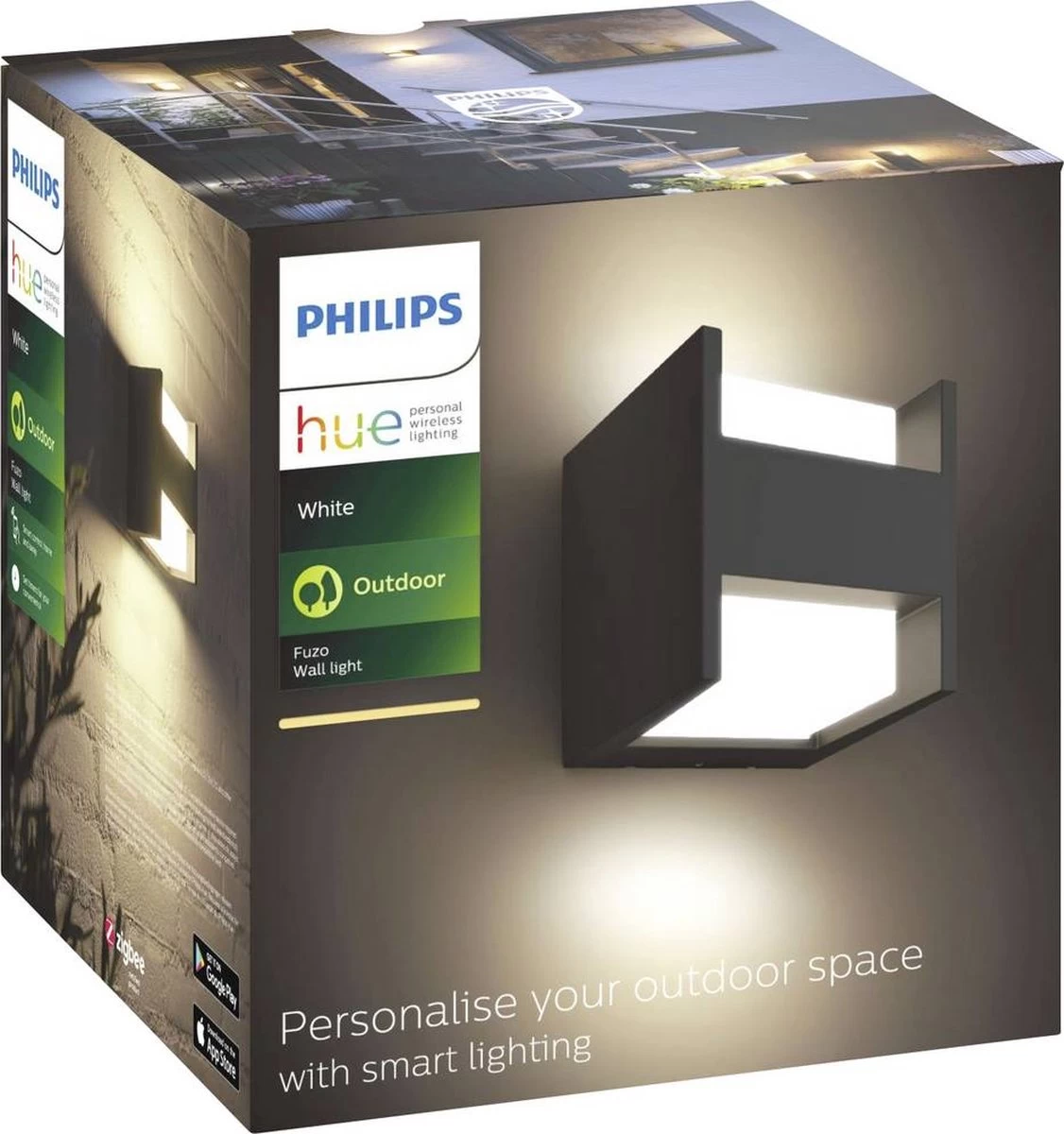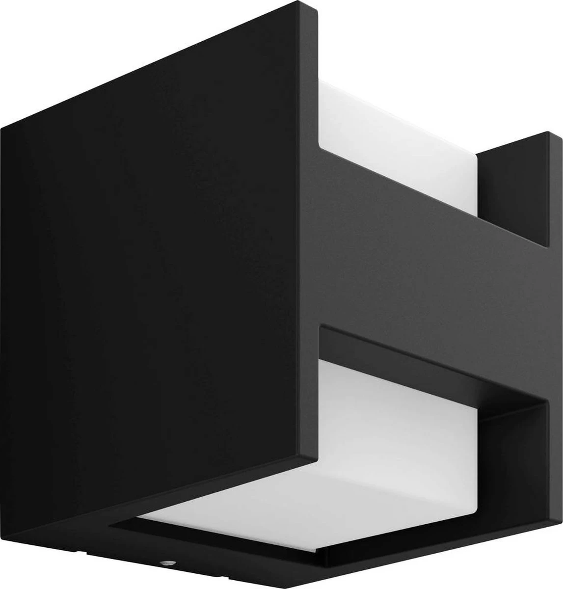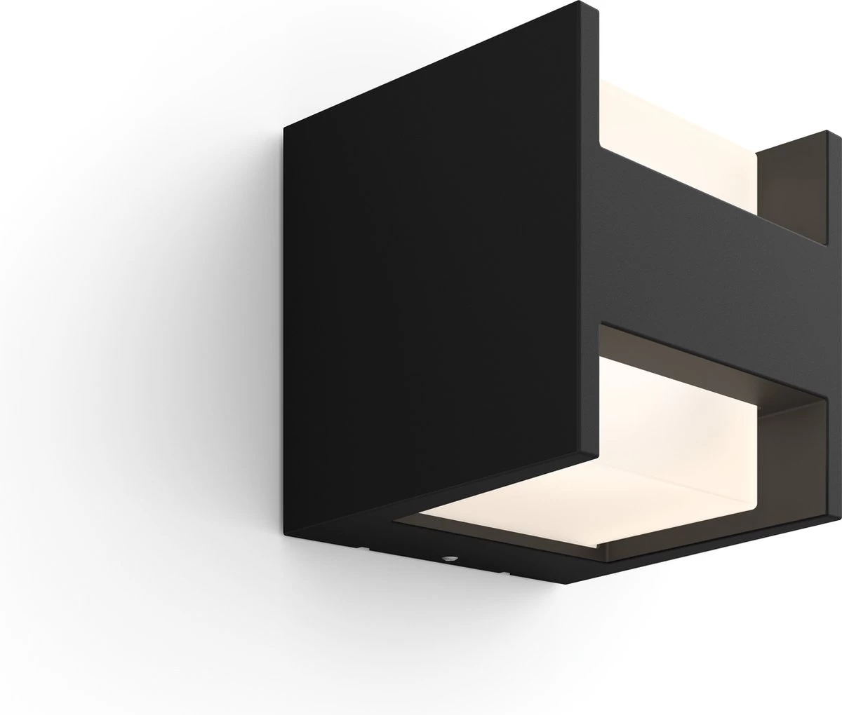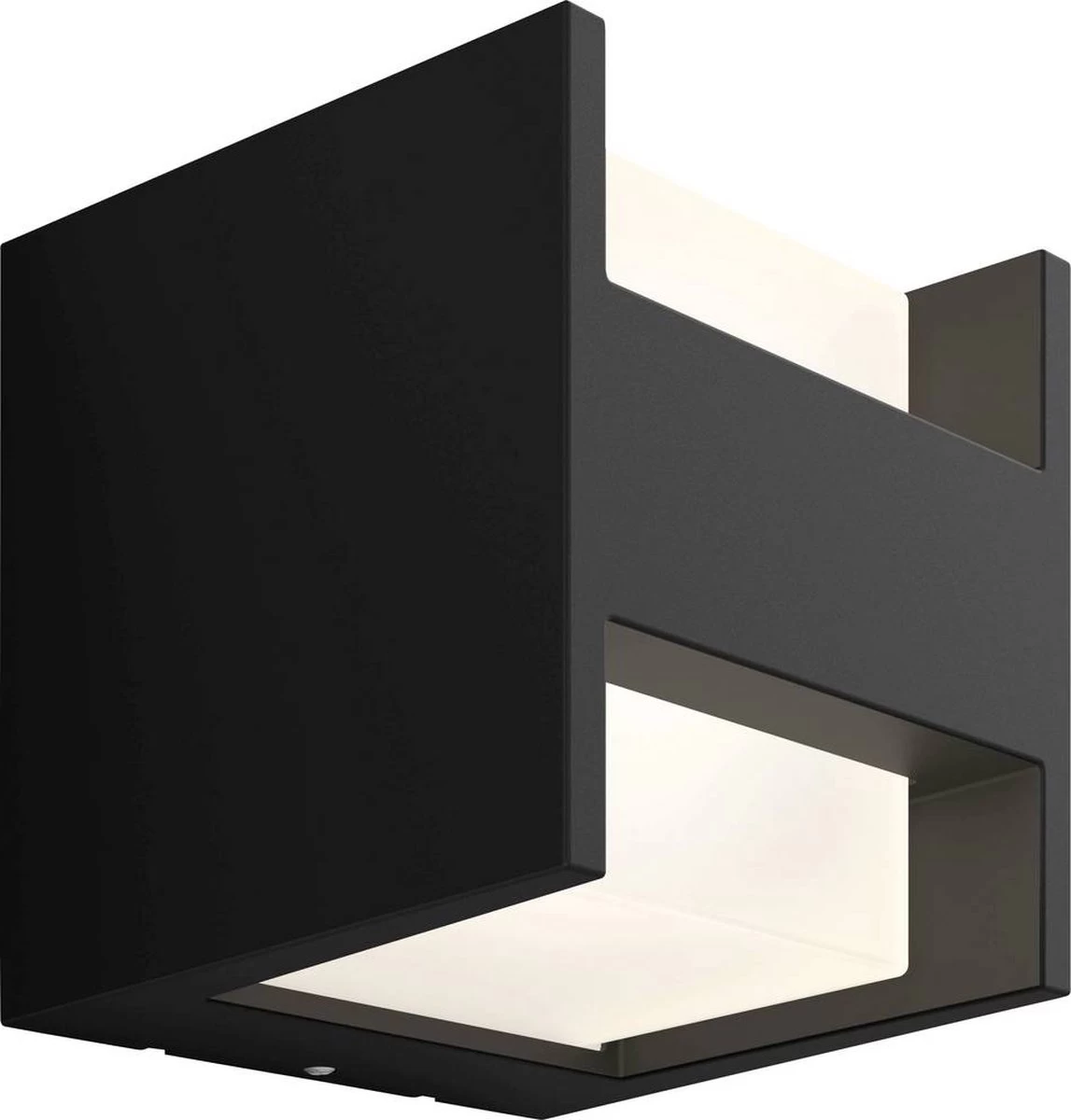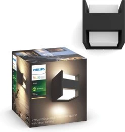 Twee lichtvlakken heeft deze strak vormgegeven zwarte Philips Hue Fuzo White muurlamp. Hij werpt warmwit LED-licht naar boven en beneden en staat mooi aan elke moderne gevel. Je kunt het licht dimmen met de Hue app op je smartphone of tablet. Verbind de lamp met een (los verkrijgbare) Philips Hue Bridge en ontdek alle slimme verlichtingsfuncties van Philips Hue zoals persoonlijke timers en geofencing (de lampen gaan automatisch aan wanneer je in de buurt komt). Deze lamp is met IP44 ontworpen: hij is spatwaterdicht en ideaal voor buiten.
