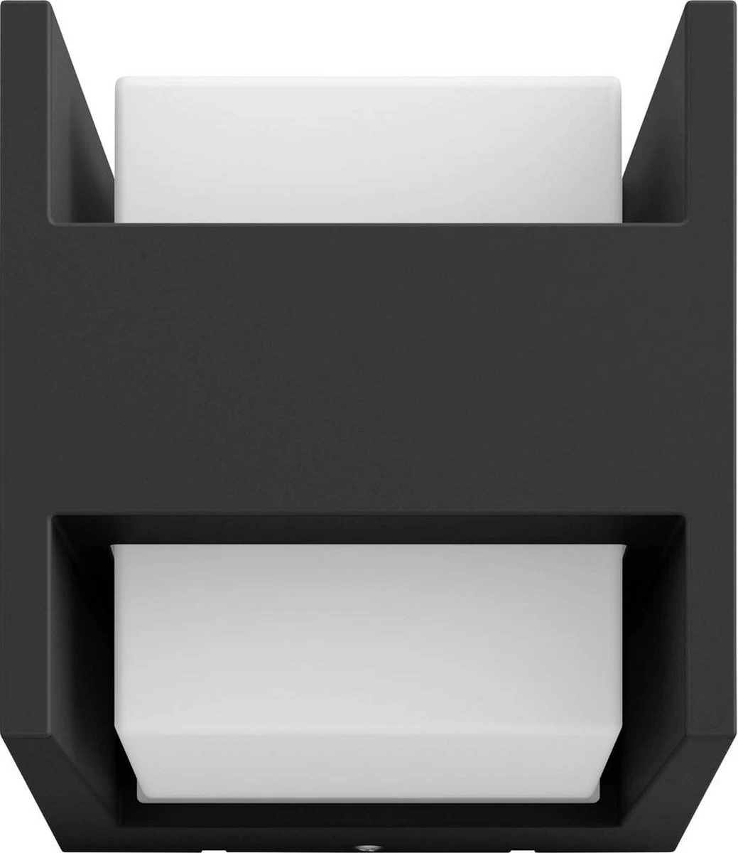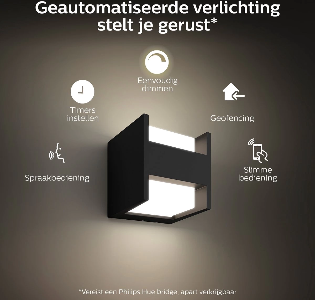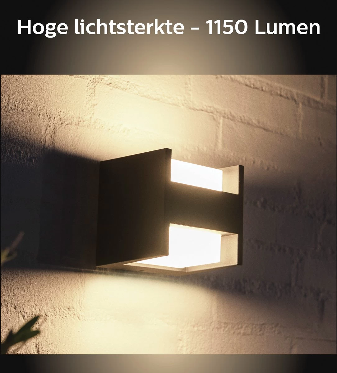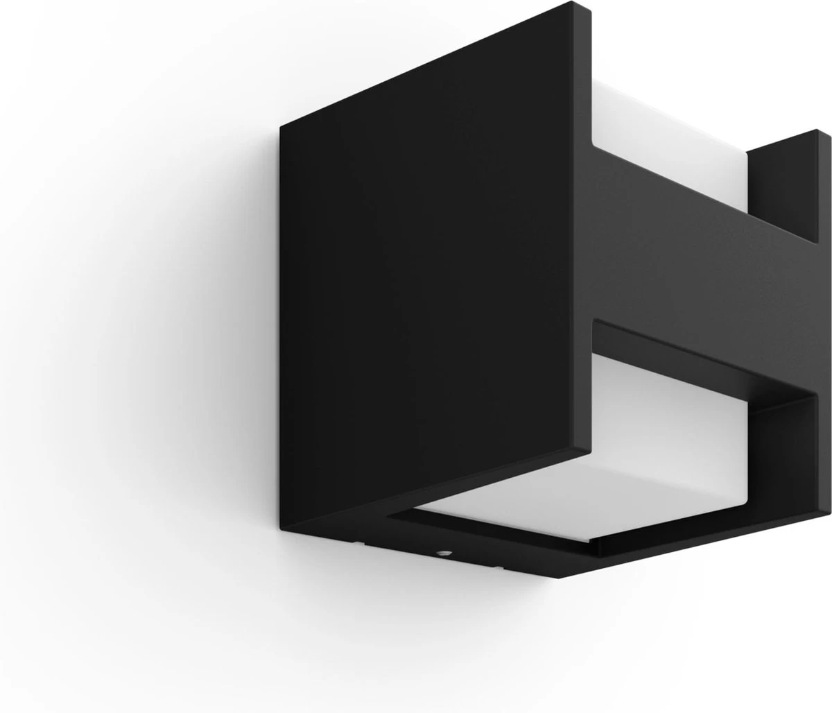 Twee lichtvlakken heeft deze strak vormgegeven zwarte Philips Hue Fuzo White muurlamp. Hij werpt warmwit LED-licht naar boven en beneden en staat mooi aan elke moderne gevel. Je kunt het licht dimmen met de Hue app op je smartphone of tablet. Verbind de lamp met een (los verkrijgbare) Philips Hue Bridge en ontdek alle slimme verlichtingsfuncties van Philips Hue zoals persoonlijke timers en geofencing (de lampen gaan automatisch aan wanneer je in de buurt komt). Deze lamp is met IP44 ontworpen: hij is spatwaterdicht en ideaal voor buiten.