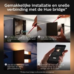 Verbind je Philips Hue lampen met de Bridge om ze te kunnen bedienen via de Philips Hue app op je smartphone of tablet. Je kunt je Philips Hue lampen ook in- of uitschakelen en dimmen met de Philips Hue binnendimmer.