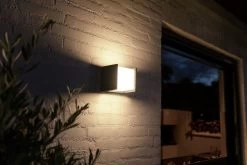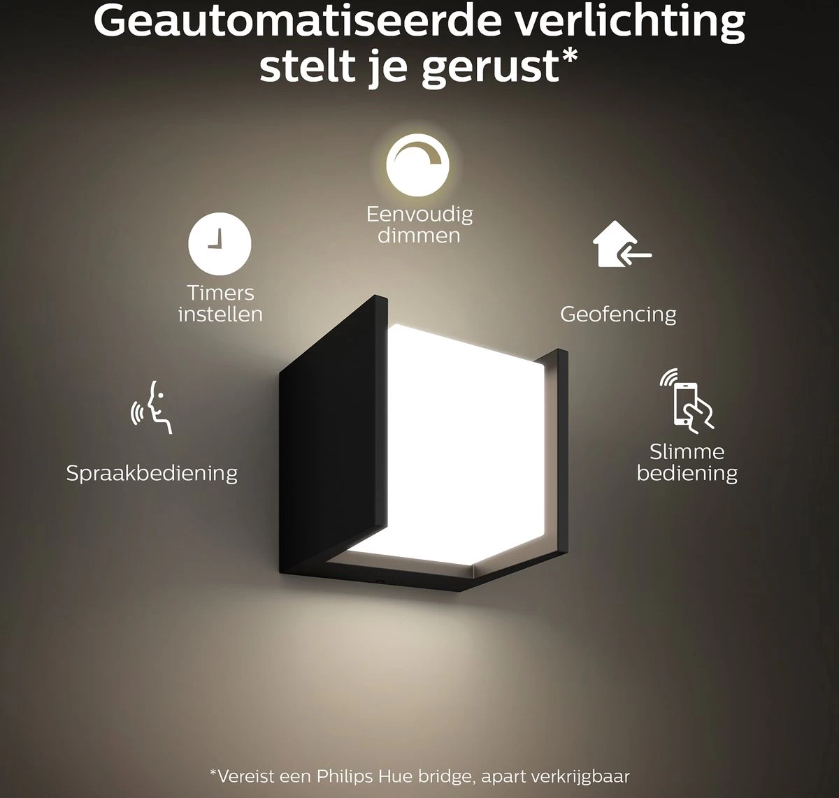 Met de strakke vormgeving en dimbaar warmwit licht is de Philips Hue Fuzo White muurlamp een mooie toevoeging aan elke moderne gevel. De Fuzo wordt verbonden met je bestaande of los verkrijgbare Hue Bridge, waarmee je toegang krijgt tot alle slimme Philips Hue functies in de Hue app, zoals timers en geofencing. Deze laatste optie zorgt ervoor dat de lamp automatisch gaat branden als je je woning nadert. Deze lamp is met IP44 ontworpen: hij is spatwaterdicht en ideaal voor buiten.