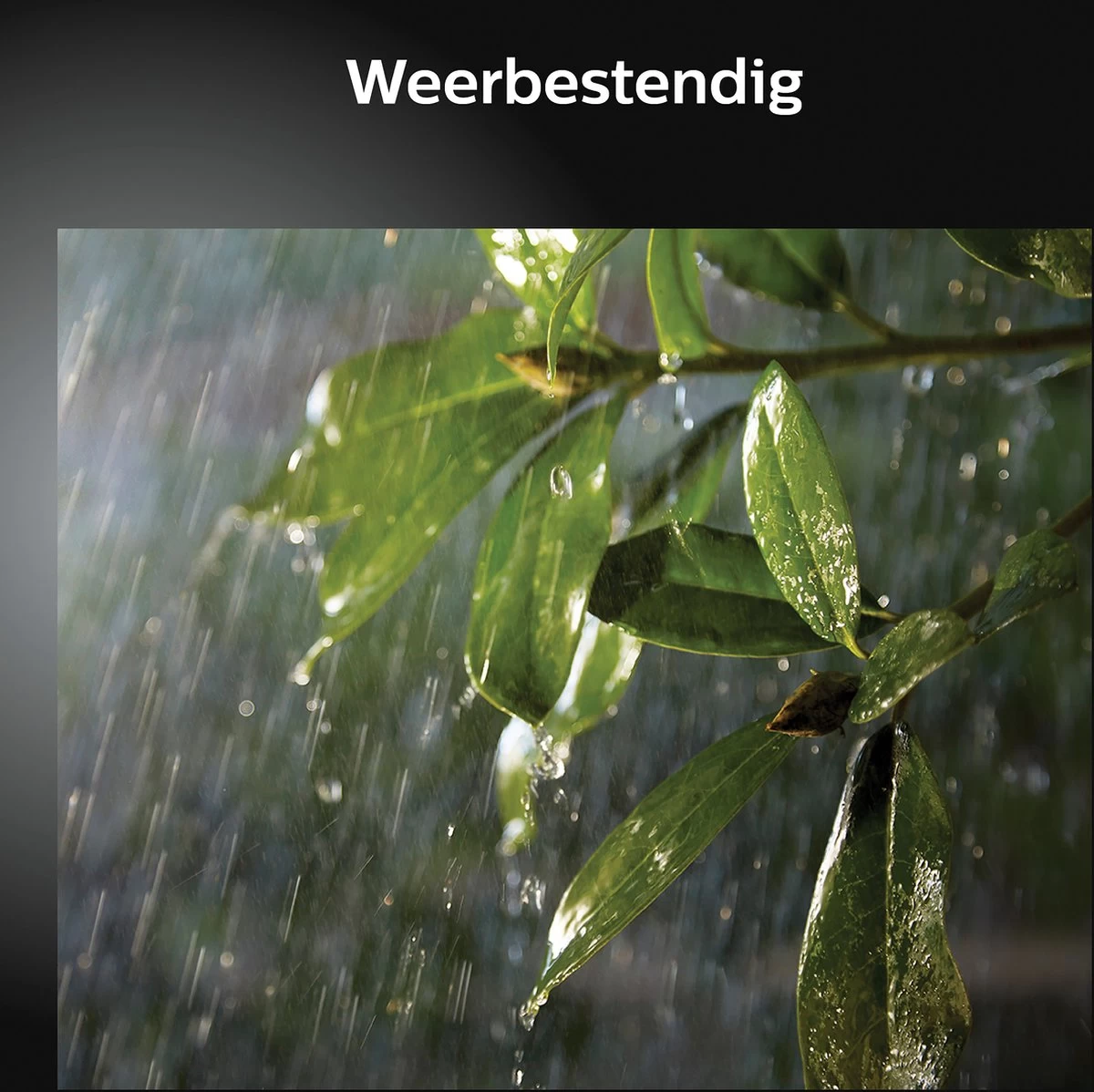 Dit Philips Hue buitenarmatuur is speciaal ontworpen voor gebruik in buitenomgevingen en is uitvoerig getest. Het IP-niveau wordt aangegeven met twee cijfers: het eerste cijfer geeft het beschermingsniveau tegen stof aan en het tweede cijfer geeft de vochtbestendigheid aan. Deze lamp is met IP44 ontworpen: hij is spatwaterdicht vanuit alle richtingen. Hierdoor is hij ideaal voor algemeen gebruik buitenshuis.