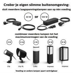 De Philips Hue Impress White and color ambiance muurlamp is modern, heeft een elegant ontwerp en straalt klasse uit. De ingebouwde LED-lamp produceert 16 miljoen kleuren licht en 50.000 wittinten. Deze lamp werkt op laagspanning en is de nieuwste aanwinst in de Impress-familie. Ideaal als uitbreiding van je Hue buitenverlichting met een laag voltage. In de doos vind je naast de lamp een kabel om aan te sluiten op de laagspanningsvoeding van je andere Hue buitenverlichting. Begin je net met je met Hue buitenverlichting en heb je nog geen voeding, dan is die los verkrijgbaar in 40W of 100W. De Impress is gemakkelijk zelf te monteren zonder hulp van een elektricien. Door de muurlamp te koppelen met de Philips Hue Bridge kun je de lamp bedienen met de Hue app op je mobiel of tablet. Bovendien krijg je dan de beschikking over allerlei slimme functies zoals timers en geofencing (buitenverlichting gaat automatisch aan als je het huis nadert). De Hue Impress muurlamp is plensdicht (IP44-norm).