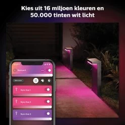 De Philips Hue Nyro White and color ambiance sokkellamp verlicht je tuinpad of oprit in alle kleuren van de regenboog. De LED-lamp geeft namelijk 16 miljoen kleuren en 50.000 wittinten. De zwarte sokkellamp werpt zijn licht rechtstreeks op de grond en dat geeft een subtiel en mooi lichteffect. Als je de slimme lamp koppelt aan je Philips Hue Bridge kun je elke gewenste kleur van je tuinpad voorprogrammeren. Je kunt de lampen dan bedienen met de Hue app via smartphone of tablet, ook als je niet thuis bent. En verder kun je gebruik maken van slimme verlichtingsmogelijkheden zoals timers en geofencing, waardoor je lampen automatisch gaan branden als je in de buurt komt. De Hue Nyro heeft bovendien een IP44 waterdicht beschermingsniveau.
