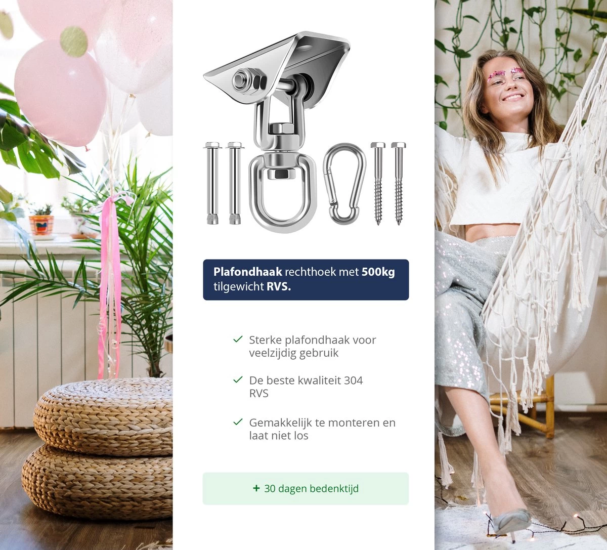 Met deze plafondhaak ben je direct klaar om je bokszak, schommel of hangstoel op te hangen. Natuurlijk ga je voor veiligheid en vakkundigheid. Gemaakt van de beste 304 RVS ijzerwaren met een tilgewicht van 500kg kan je met deze beugel elke kant op. De set komt met bevestigingsmateriaal, het enige wat je zelf nodig hebt is een boor.