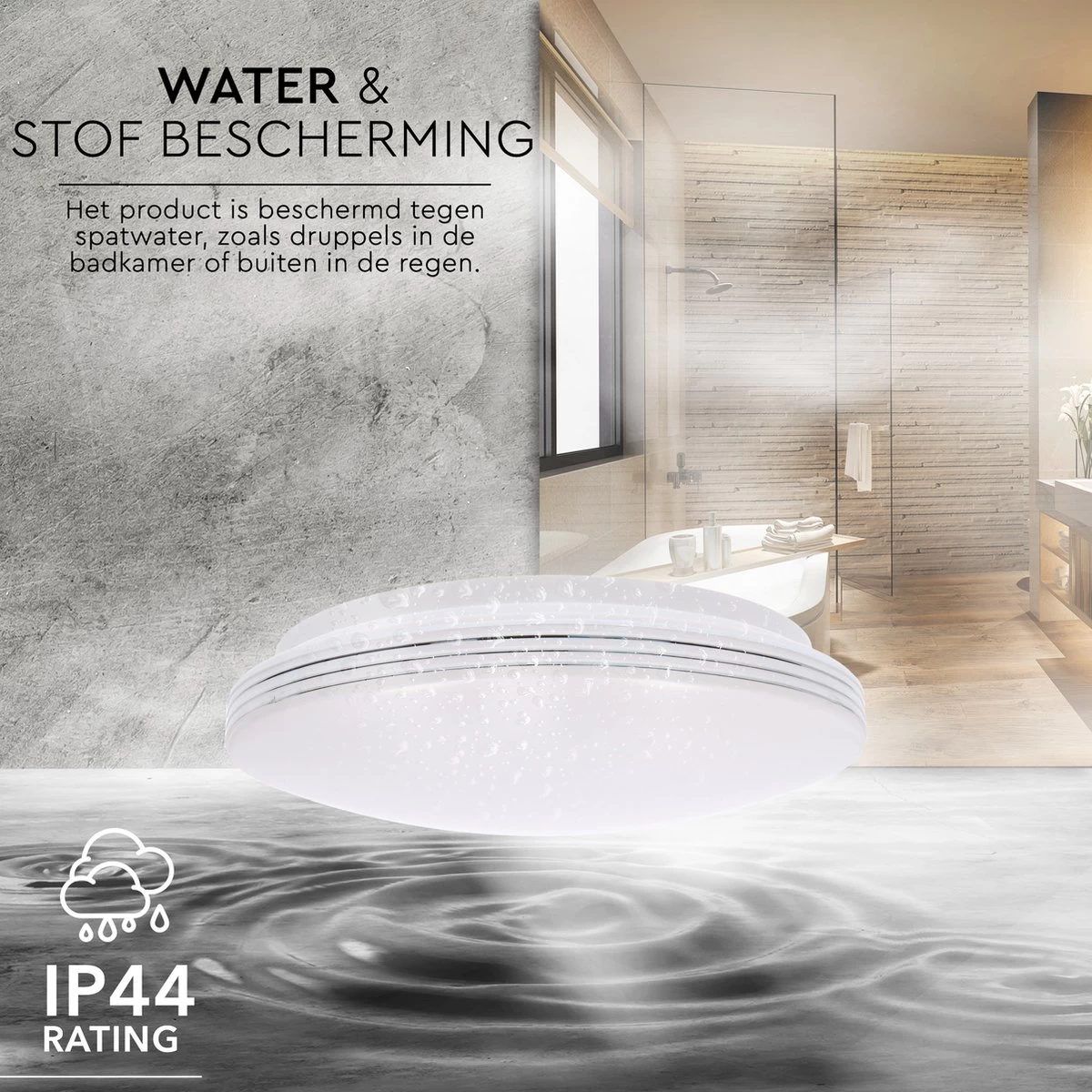 IP-waarde: IP44 – Spatwaterdicht – Geschikt voor vochtige binnen en buitenruimtes waaronder je badkamer (Zone 2)