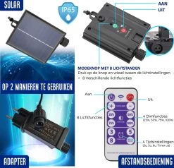 Dit lichtsnoer op zonne-energie creëert de perfecte sfeer voor elke gelegenheid. Het snoer is 15 meter lang en voorzien van 12 lampjes. Zo is de lichtslinger ideaal om de tuin mee te versieren tijdens de koude, donkere wintermaanden. Maar ook voor de zomerperiode is de solar tuinverlichting perfect, zodat je de hele avond buiten kunt blijven zitten onder de gezellige sfeerverlichting. Uitstekend voor verjaardagen, barbecues en andere avonden in de tuin. De lichtsterkte is volledig naar wens in te stellen met de afstandsbediening, die bovendien ook beschikt over een timerfunctie.