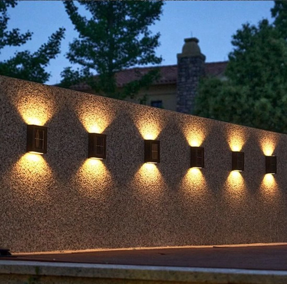 De wandlamp heeft een erg strak design, en is daarmee niet alleen ’s avonds en ’s nachts een smaakvolle toevoeging aan uw tuinverlichting, maar is hij ook overdag leuk om te zien. De lamp laadt zichzelf overdag op via een zonnepaneel, om uw voor- of achtertuin in het donker van een warm wit licht te voorzien. Hang deze set eenvoudig op waar u wil en u heeft er geen omkijken meer naar!