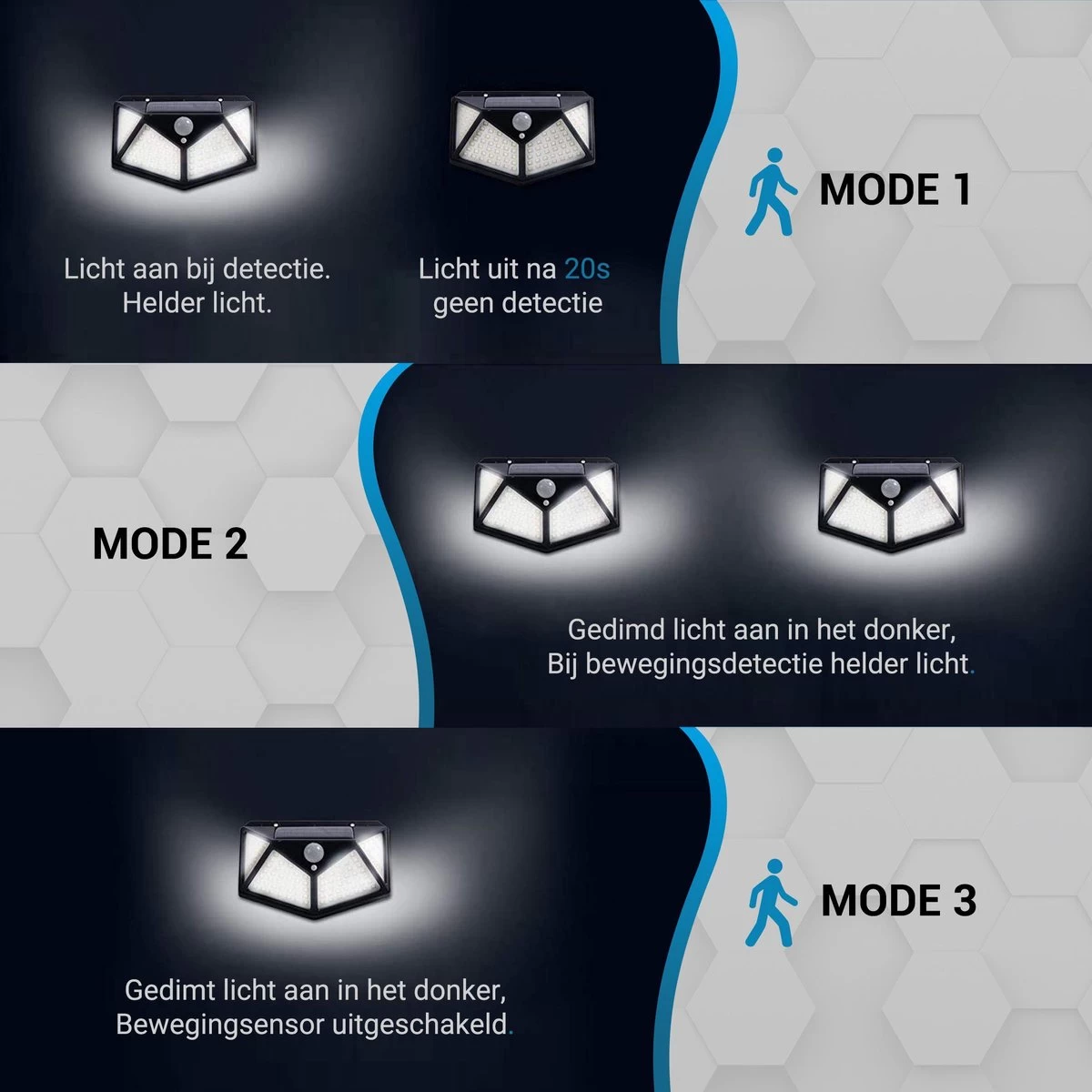 Deze buitenverlichting heeft 3 verschillende standen, waardoor jij deze lamp multifunctioneel kunt gebruiken! Stand 1: Medium licht wat continu brand (brand 4 tot 6 uur). Stand 2: Gedimd licht wat continu brand, wanneer de bewegingssensor beweging ontvangt brandt er 30 seconde fel licht. Stand 3: Geen verlichting, wanneer de bewegingssensor beweging ontvangt brandt er 30 seconde fel licht.